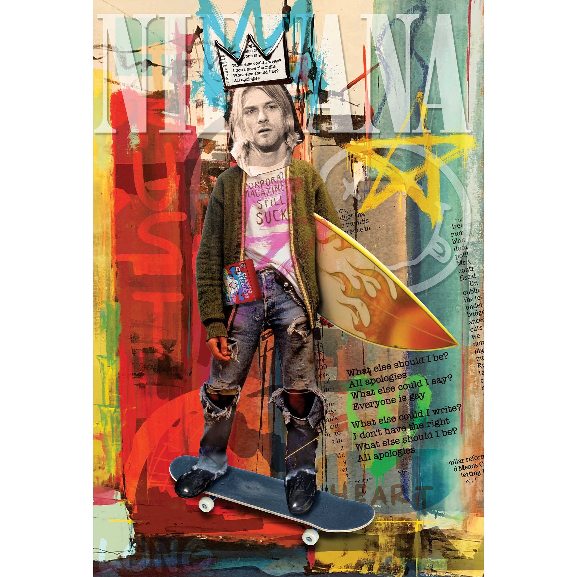 Grunge Coastline — a layered mixed-media collage that blends coastal attitude with grunge-era iconography: torn-paper textures, bold color blocks, and a crowned figure balancing surf and street. It’s loud in the right way—built to command a wall from across the room, then reward you up close with details and hidden marks.